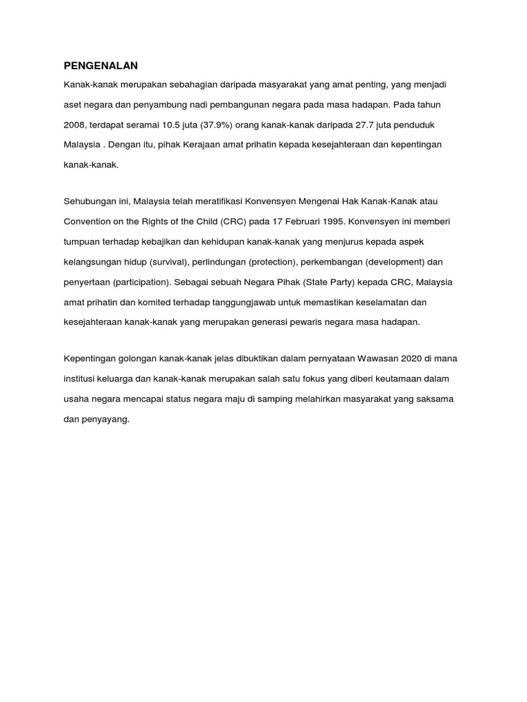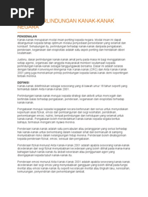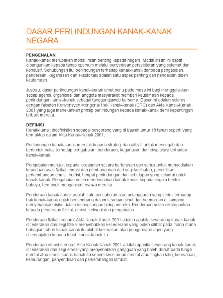 ABSTRAK Dasar Perlindungan Kanak-Kanak Negara merupakan satu dasar yang mengandungi pernyataan mengenai prinsip perlindungan kanak-kanak selaras dengan peruntukan Konvensyen Mengenai Hak Kanak-kanak CRC dan Akta Kanak-Kanak 2001. View DASAR PERLINDUNGAN KANAKdocx from BUSINESS 3111 at Universiti Putra Malaysia. Asas Kewarganegaraan Perlindungan anak.